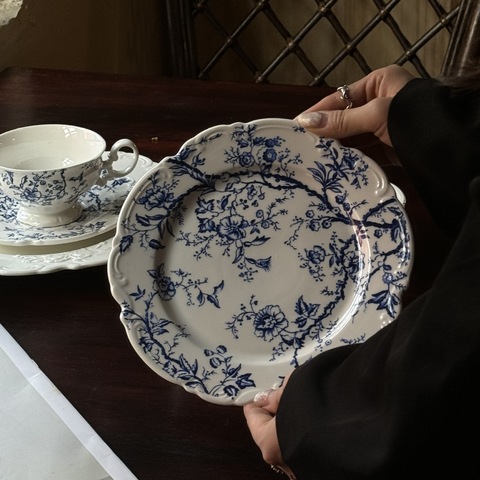 Franse Vintage Kant Blauwe Bloemen Porseleinen Servies Sets Elegante Retro Antieke Stijl Westers Ontbijt Borden