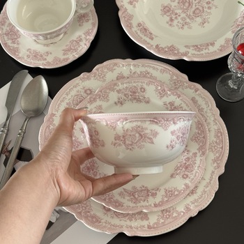 Europese Roze Bloemenprint Keramische Beker En Bord Servieset Met Reliëf Vintage Dinerbordsets Voor Bruiloft